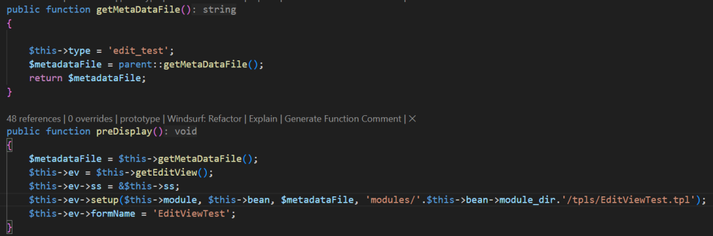ở vd trên thì mình sẽ bắt theo $_REQUEST[‘type’] để điều hướng vào đúng view và viewdefs mình cần, nó sẽ là .view.<$this->view>.php và <$this->view>viewdefs.php để tiếp tục chỉnh sửa.. Lấy vd nếu type mình là test mình sẽ vào view.edit_test.php và edit_testviewdefs.php để tiếp tục chỉnh sửa.