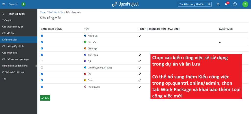 - Tab Các kiểu công việc (Nhiệm vụ / Lỗi / Giai đoạn… để phân loại công việc)