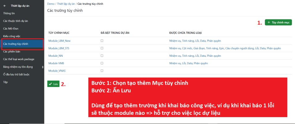- Tab Các trường tùy chỉnh (Tạo thêm trường để phân loại, như trong 1 số dự án sẽ là trường khai báo module)