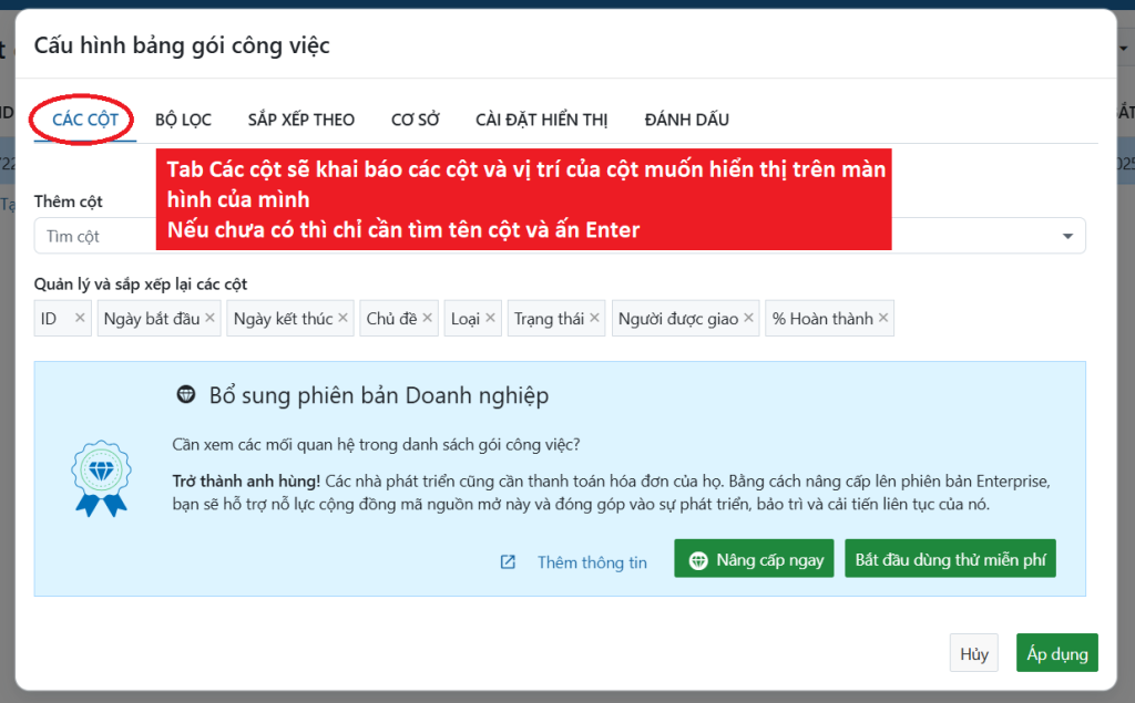 1. Bổ sung và sắp xếp các cột muốn thể hiện trong dự án